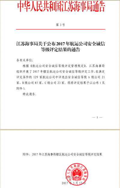 Zhonggang Construction Group., Ltd. was Granted “Class A Safe and Honest Company” in Shipping Company Safety and Honesty Grading 2017 Sponsored by Jiangsu Maritime Safety Administration