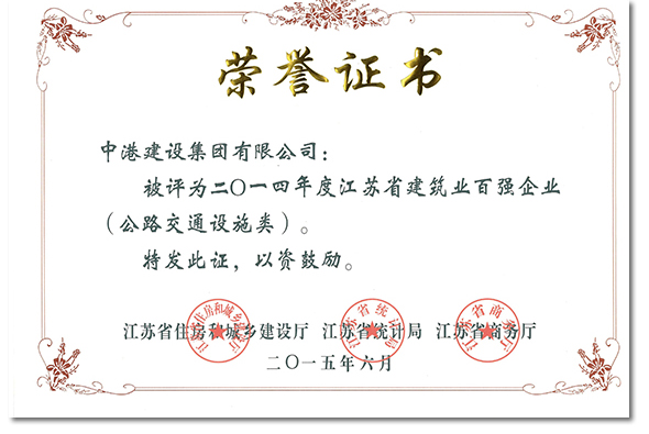 On June 11, 2015, Jiangsu Construction Industry Innovative Development and 2014 Top-100 Enterprises Conference jointly held by Jiangsu Housing and Urban-Rural ConstructionDepartment, Jiangsu Statistics Bureau and Jiangsu Commerce Department is convened in Nanjing City. At the conference, Zhonggang Construction Group Co., Ltd. is awarded as the “Jiangsu Top-100 Enterprise in Construction Industry in 2014”, which is the only enterprise obtaining this award in the road transport facility industry. The president of company Qin Gao attended the conference and received the certificate and medal.